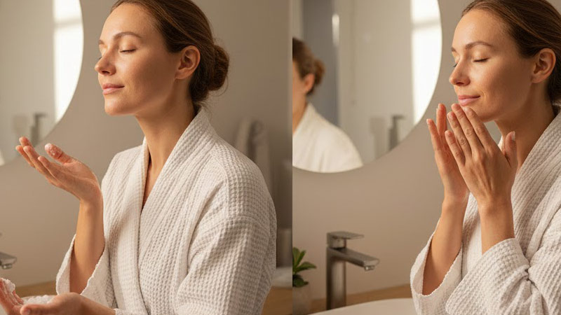 - ماساژ ملایم: با انگشتان مرطوب، به آرامی و بهصورت دایرهای و ملایم به مدت ۳۰ تا ۶۰ ثانیه پوست را ماساژ دهید.