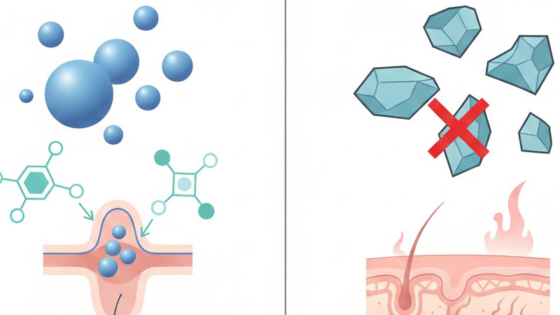 - دانههای خشن و تیز: دانههای بزرگ و ناصاف (مانند پوست گردو خردشده بهشکل نامناسب) میتوانند باعث ایجاد آسیبهای میکروسکوپی شده و سد دفاعی پوست را تخریب کنند.