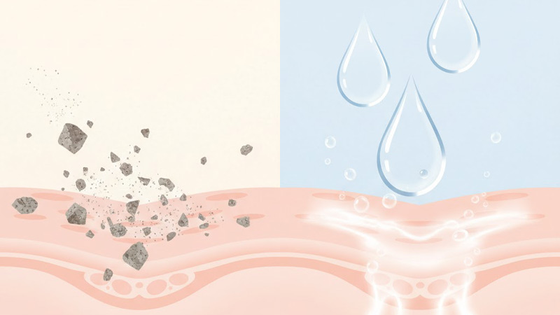خیلی از مشتریان ما میپرسند “اسکراب بهتر است یا سرمهای اسیدی؟”. پاسخ این است که کارکردشان متفاوت است. اسیدها (شیمیایی) چسب بین سلولها را حل میکنند و اثرگذاریشان زمانبر است؛ اما اسکراب (فیزیکی) با یک سایش مکانیکی ملایم، سلول مرده را «همان لحظه» جدا میکند. اگر مشکلتان بافت زبر سطحی است، اسکراب سریعترین راه حل است. اگر مشکل جوش عمقی یا لک قدیمی است، لایهبردار شیمیایی مکمل خوبی خواهد بود.