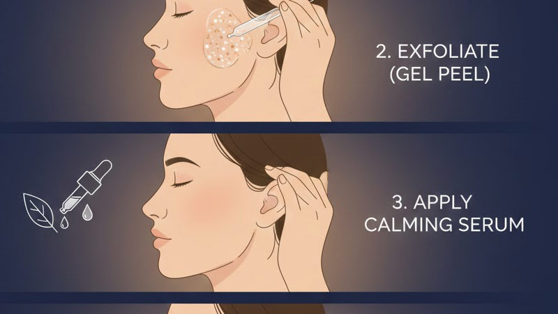 برای اینکه حداکثر نتیجه را از ژل لایهبردار خود بگیرید و از بروز التهاب جلوگیری کنید، لازم است ترتیب روتین مراقبت از پوست خود را به درستی رعایت کنید. این راهنمای گامبهگام به شما کمک میکند: